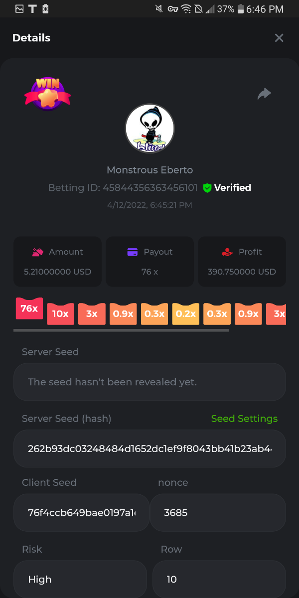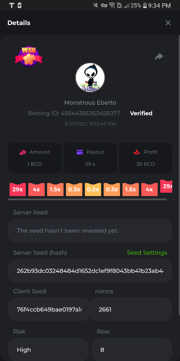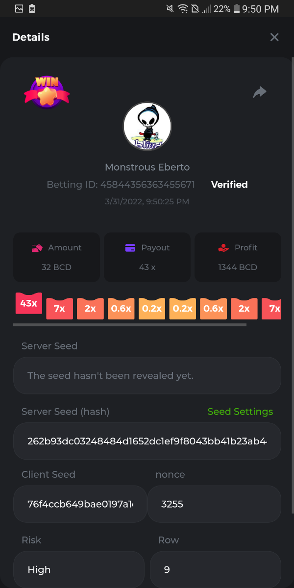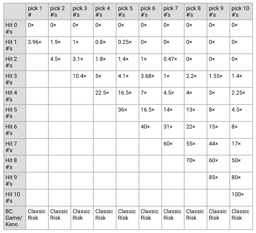 In case anyone finds these helpful. Low Risk Payouts; Classic Risk Payouts; Medium Risk Payouts; High Risk Payouts; If you spot any mistakes please let me know and ill fix it really quick. I've double checked multiple times and i dont see any myself. Should be good to go. Gonna post them in Keno section as well.