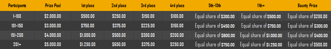 $1,500 Weekend Multiplier Battle Hey, hey, VIPs! We're delighted to announce a Halloween weekend-long battle with the Evoplay provider. The event will occur from October 28, 12:00 pm GMT until October 31, 12:00 pm GMT. To qualify for the prize, you must participate and get the highest multiplier possible on the games listed below. This is your chance to win some candy and show off your skills. So get ready to battle it out and have some fun! - (details further down). Duration: 28/10/2022 12:00pm – 31/10/2022 12:00pm UTC Prize Pool: $1,500 Eligible Games: Play below games to participate in this event: Blessed Flame Wild Overlords Bonus Buy Rueda De Chile Hot Triple Sevens Special The highest multiplier reached in each game will be added together and counted as total points. Bonus buys are allowed. If the player submits multiple winning entries for the same game, the entry with the highest multiplier will be valid. Minimum VIP Tier Must be VIP04 or higher in order to enter this event. Minimum Payout Minimum payout to qualify is 10x (in any game) for a valid entry. Minimum Bet Size Blessed Flame - $0.10 Wild Overlords Bonus Buy - $0.10 Rueda De Chile - $0.10 Hot Triple Sevens Special - $0.10 Eligible Coins All cryptocurrencies are eligible (excepting JB, and BCL). Free Play Mode is not valid for this event. Prize Pool & Reward Breakdown The winners will win a share of the prize pool based on the detailed ranking below. All other participants who complete all minimum requirements will receive a 35% share of the prize pool. How to Enter Access the game to select your Bet ID, click on the Share icon (↷) and then Copy link. Return to the topic, paste the link in the field "Reply to this topic..." E.g.: https://bc.game/#/sd/10VZTGSD9VPUS3 In the same post, upload a screenshot of your win by clicking the game ID WITH VIEW IN USD mode ENABLED (accessible at the bottom of dropdown menu for your wallet up top, and Submit Reply. Done! This way, we can ensure that your bet indeed met the minimum requirement at the time of placing it: https://bc.game/#/sd/10VZTGSD9VPUS3 Additional Rules: Please combine all of your hits together in a SINGLE post. Edit your existing post for additional hits, don't create a new post. Each eligible entry must have the Bet Slip URL, failure to include it will disqualify participation in the event. Bet Slip image is not mandatory. Bets must be posted within 24 hours of placing bet in order to keep things fair for everyone. Bets must be made during the specified time window stated above. This thread will lock automatically when the time period is over. One (1) entry per household. Anyone found attempting to win multiple prizes will be disqualified from this challenge as well as all future challenges. Failure to follow instructions will result in your submission being null and void. By entering this challenge, you acknowledge that BC.Game has the final decision on results and placement. Payouts will be distributed after the event is finished. Please note that it could take anywhere between 24 hours to 7 days after the completion of the event.