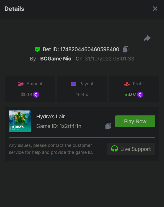 $1,500 Midweek Multiplier Battle Hey VIPs! The weekend is over, but that doesn't mean the fun has to end! We are glad to announce a new event with the Mascot provider. It runs from October 31 until November 02, and each participating in the event must achieve the highest payout possible on the Mascot slots listed below. Plus, all eligible participants will be rewarded equally. Trick or treat safely and have lots of fun! – (Check all the conditions for participation below). Duration: 31/10/2022 2:00pm – 02/11/2022 2:00pm UTC Prize Pool: $1,500 Eligible Games: Play below games to participate in this event: The Evil Bet Queen of Spades Hell'Sing Re Kill Hydra's Lair The highest multiplier reached in each game will be added together and counted as total points. Bonus buys are allowed. If the player submits multiple winning entries for the same game, the entry with the highest multiplier will be valid. Minimum VIP Tier Must be VIP04 or higher in order to enter this event. Minimum Payout Minimum payout to qualify is 10x (in any game) for a valid entry. Minimum Bet Size The Evil Bet - $0.15 Queen of Spades - $0.20 Hell'Sing - $0.40 Re Kill - $0.20 Hydra's Lair - $0.20 Eligible Coins All cryptocurrencies are eligible (excepting JB, and BCL). Free Play Mode is not valid for this event. Prize Pool & Reward Breakdown The winners will win a share of the prize pool based on the detailed ranking below. All other participants who complete all minimum requirements will receive a 35% share of the prize pool. How to Enter Access the game to select your Bet ID, click on the Share icon (↷) and then Copy link. Return to the topic, paste the link in the field "Reply to this topic..." E.g.: https://bc.game/#/sd/10W7C4O31G3KER In the same post, upload a screenshot of your win by clicking the game ID WITH VIEW IN USD mode ENABLED (accessible at the bottom of dropdown menu for your wallet up top, and Submit Reply. Done! This way, we can ensure that your bet indeed met the minimum requirement at the time of placing it: https://bc.game/#/sd/10W7C4O31G3KER Additional Rules: Please combine all of your hits together in a SINGLE post. Edit your existing post for additional hits, don't create a new post. Each eligible entry must have the Bet Slip URL, failure to include it will disqualify participation in the event. Bet Slip image is not mandatory. Bets must be posted within 24 hours of placing bet in order to keep things fair for everyone. Bets must be made during the specified time window stated above. This thread will lock automatically when the time period is over. One (1) entry per household. Anyone found attempting to win multiple prizes will be disqualified from this challenge as well as all future challenges. Failure to follow instructions will result in your submission being null and void. By entering this challenge, you acknowledge that BC.Game has the final decision on results and placement. Payouts will be distributed after the event is finished. Please note that it could take anywhere between 24 hours to 7 days after the completion of the event.