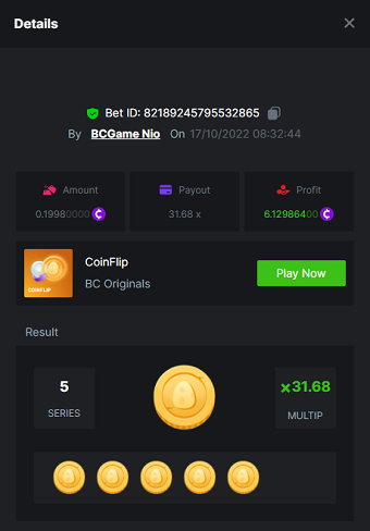 $2.5k Prestige Coinflip Challenge #51 Starts: 17, October 3:30pm GMT Ends: 24, October 3:30pm GMT Hey everyone! We're giving away $2,500 in prizes from our Prestige challenge. The game we've selected is in-house Coinflip, where the Top 10 will take home a major prize, and the remaining $700 will be split between all other participants. Additionally, any player who completes the extra bounty will receive an equal share of 20% of the prize pool. Heads or tails? Every day is a new chance to turn an normal day into a joyous event - (details further down). What's the Challenge? Win the highest multiplier you can on in-house Coinflip (Most flips in a row). If there is a tie, the player with the higher average bet amount (in USD) shall be the winner. If there is a tie in the amount and payout, the one who posted or edited his post first will be considered in the Ranking. Minimum VIP There's no minimum VIP level Minimum Payouts Minimum payout to qualify is 31.68x (5 Flips) Minimum Bet Size $0.15 USD equivalent Eligible Coins All cryptocurrencies are eligible (excepting JB) Available Prizes 1st Place....... $500 2nd Place..... $300 3rd Place...... $200 4th Place......$100 5th Place......$50 6th-10th.........$30 All other participants.........$700 Bounty Prize...$500, equal share. EXTRA BOUNTY Share a bet completing 9 Flips or more (Even losing a bet also counts), and receiving an equal share of the $500 prize pool! Original rules apply with all minimum requirements. E.g: Let's say someone completed 9 flips but lost on the 10th flip, the bet still counts as a reward. How to Enter To enter, copy the link of the bet you'd like to submit. Once you've copied it, paste it as a reply to this thread like so: Link: https://bc.game/#/sd/10V8P6Z205BBBN In the same post, upload a screenshot of your win by clicking the game ID WITH VIEW IN USD mode ENABLED (accessible at the bottom of dropdown menu for your wallet up top. This way, we can ensure that your bet indeed met the minimum requirement at the time of placing it: Link: https://bc.game/#/sd/10V8P6Z205BBBN Please combine all of your hits together in a SINGLE post. Edit your existing post for additional hits, don't create a new post. Each eligible entry must have the Bet Slip URL, failure to include it will disqualify participation in the event. Bet Slip image is not mandatory. Bets must be posted within 24 hours of placing bet in order to keep things fair for everyone. Bets must be made during the specified time window stated above. This thread will lock automatically when the time period is over. One (1) entry per household. Anyone found attempting to win multiple prizes will be disqualified from this challenge as well as all future challenges. Failure to follow instructions will result in your submission being null and void. By entering this challenge, you acknowledge that BC.Game has the final decision on results and placement. Payouts will be distributed after the event is finished. Please note that it could take anywhere between 24 hours to 7 days after the completion of the event. Good luck everyone!