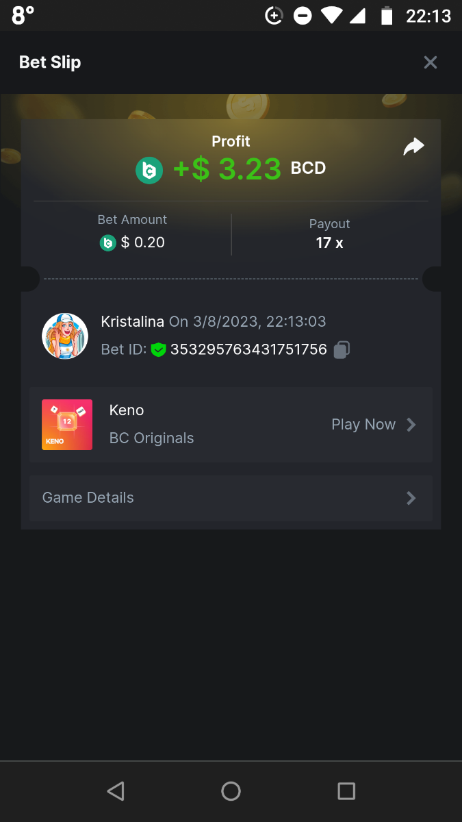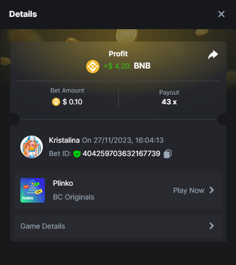 2. Easy 1. Deposit Txid: 4434113e293eb472a7b171d17fbe54cbfb34631824705869716f789ec0040181 2. Instagram: @LincesaMdq 3. Instagram Post: https://www.instagram.com/p/DHXgr4JspCP/?igsh=ZWgwenpqYXVreTF 4. Twitter: @Kristalinauwu 5. Like, retweet & tag: @Kristalinauwu https://x.com/Kristalinauwu/status/1901728054969274750 6. Follow BCGame Facebook: Gisela Gall 7. Limbo: https://bc.co/game-detail/1825513481832927011 8. Sports bet: Ticket ID: 2513820866270339253 9. Arabian Secret: https://bc.co/game-detail/1825439374915515681 10. Sugar Fiesta 1000: https://bc.co/game-detail/1825441146495751971 11. 2FA activated: Medium 1. Deposit TxID: 4d707ead402ff5771e270374a5fc42f5798fdc6bd13d6bf975996a5316cb53ff TxID: 39d9776a52287c2bdc8bea45c1a751ae618ef4976ed8907766ce39ac0603937f 2. Crash: https://bc.co/game-detail/1825546630112045702 3. Plinko: https://bc.co/game-detail/1825430753182757665 4. Roulette: https://bc.co/game-detail/1825527742035924514 5. Starshine Princess 1000: https://bc.co/game-detail/1825598330617384993 6. Stellar Rush: https://bc.co/game-detail/1825601183186807841 7. Keno: https://bc.co/game-detail/1825612623614982433 8: Poker Ways: https://bc.co/game-detail/1825547398747784483 9. Wukong: https://bc.co/game-detail/1825595350268898850 10. Lottery and Porsche tickets: 11. Sports bet Combo Ticket ID: 2512055034057994476 Hard 1. Wheel: https://bc.co/game-detail/1825529693239491107 2. Crash: https://bc.co/game-detail/1825774085023770502 3. CoinFlip: https://bc.online/game-detail/1825620056214876707 4. Stellar Rush: https://bc.co/game-detail/1826242186137422626 5. Plinko: https://bc.co/game-detail/1825459660201698850 6. Limbo: https://bc.online/game-detail/1826864347105905955 7. Hashdice: https://bc.online/game-detail/1826862839661034018 8. Sea of Olympus 1000: https://bc.co/game-detail/1825539068560977186 9. Gold of Olympus: https://bc.online/game-detail/1826344599486243619 10. Duck Hunter: https://bc.co/game-detail/1825605420251285539 11. Sports bet combo Ticket ID: 2513187573116055908