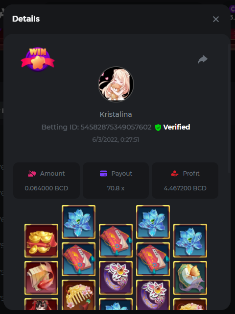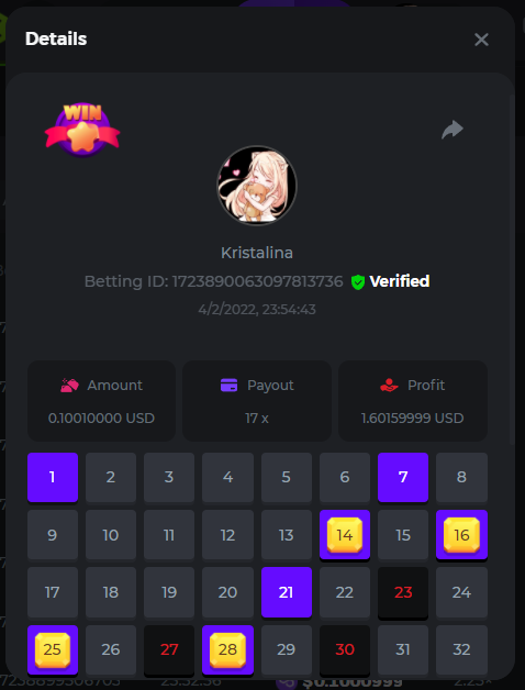 3. Game: Mines Hunt: I BCGAME Description: Set the game with 2 mines, and spell I BCGAME, letter by letter as shown in the example: Bets must be placed in that exact order, all in a row without busting. Only winning bets are valid. Minimum bet size: $0,05 USD or equivalent. All bets must have the same bet amount. Elegible coins: All coins are elegible, except for JBs. Payout : The highest bet amout wins. To enter, post your bets in the following format, with view in USD mode enabled: Betting ID: 50112102156730589