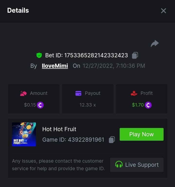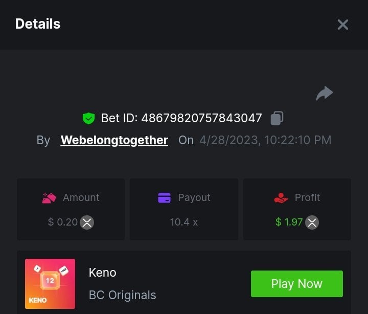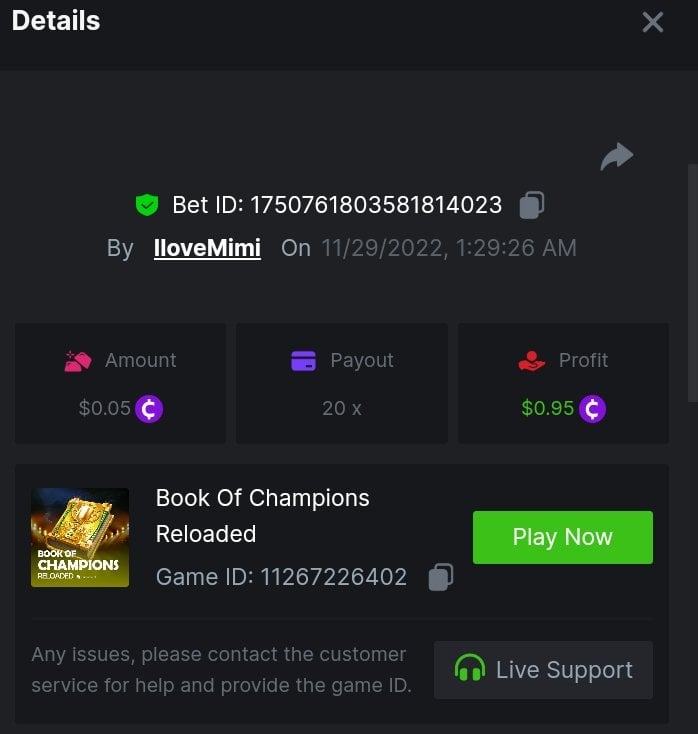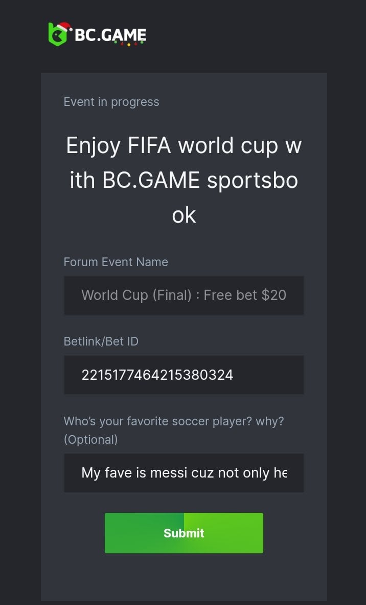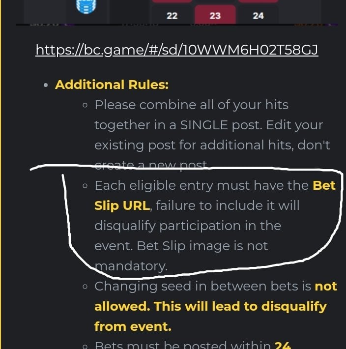 https://bc.game/#/sd/10XXOCI8VH2IHF https://bc.game/#/sd/10XXOFIP2U9PG3 https://bc.game/#/sd/10XXOG2ES48J6B https://bc.game/#/sd/10XXOGNWNAB40J https://bc.game/#/sd/10XXOHERJ7G4R7 I think its correct according to the game rules!(while Bet link is mandatory, Bet Slip Image is optional) Sorry for meddling.