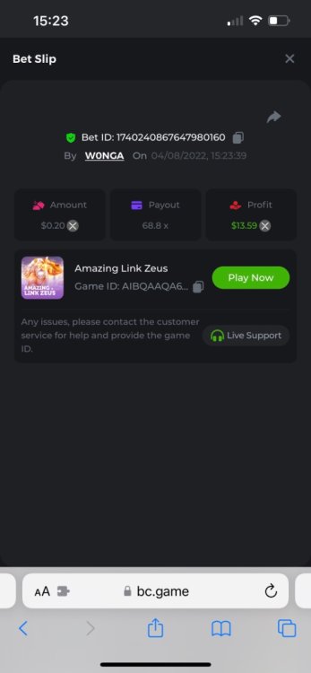 https://bc.game/#/sd/10YFF23M9VN76B This was a clean 50x win on $0.10! But the the dollar conversion says different. https://bcgame-dk2.pragmaticplay.net/gs2c/lastGameHistory.do?symbol=vs10bbbonanza&mgckey=AUTHTOKEN@11cc628b718a1c586678b11736e84ea3dfa730c7917478308de6e25bef028d13~stylename@bcgame_bcgame~SESSION@23942c19-4f81-4335-ac9a-6cefff7f9a75~SN@192ffaf4&tz=-00%3A00&mgckey=AUTHTOKEN@11cc628b718a1c586678b11736e84ea3dfa730c7917478308de6e25bef028d13~stylename@bcgame_bcgame~SESSION@23942c19-4f81-4335-ac9a-6cefff7f9a75~SN@192ffaf4 https://bc.game/#/sd/10YFG753VMQS5V https://bc.game/#/sd/10YFGJAIT2RMS3 https://bc.game/#/sd/10YFGXMC5YV8K3 https://bc.game/#/sd/10YGZ4VK6RWOIB -