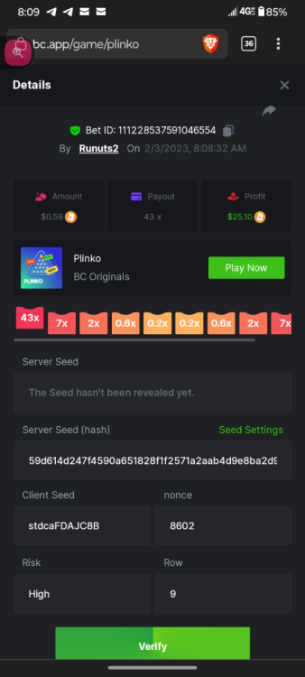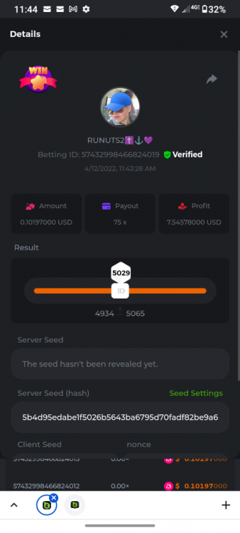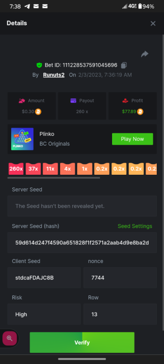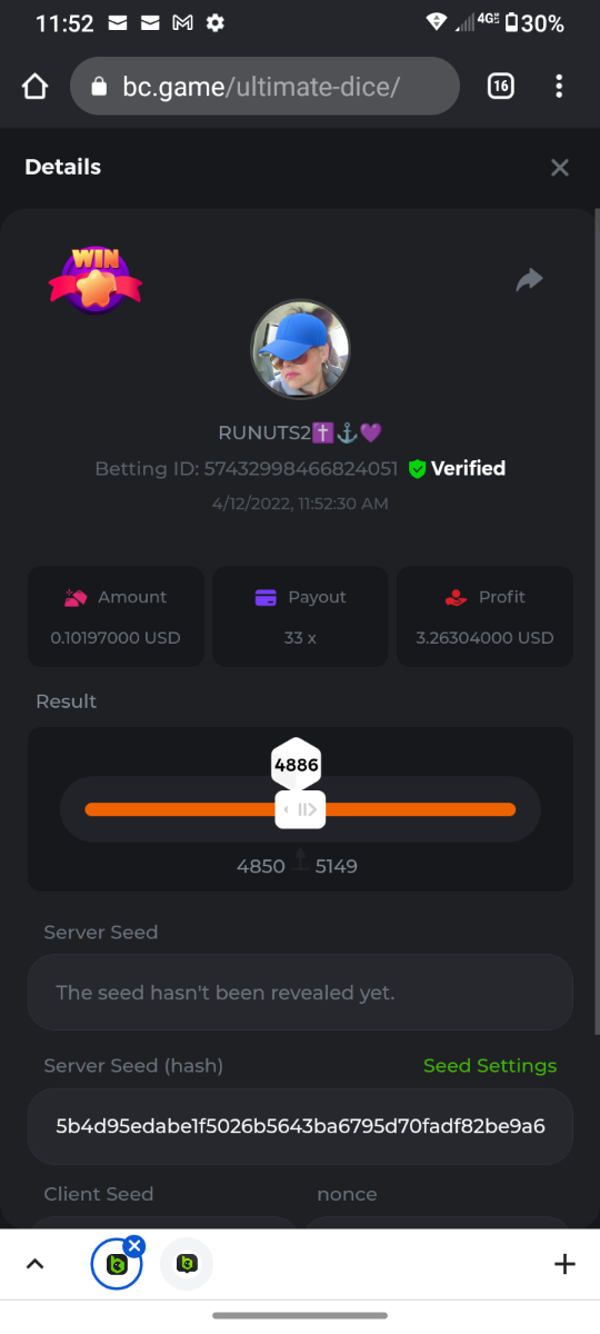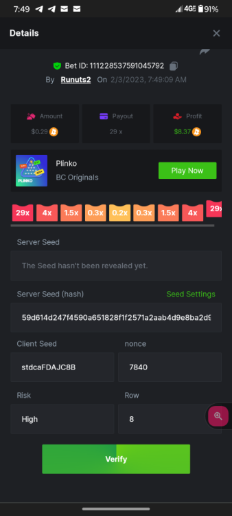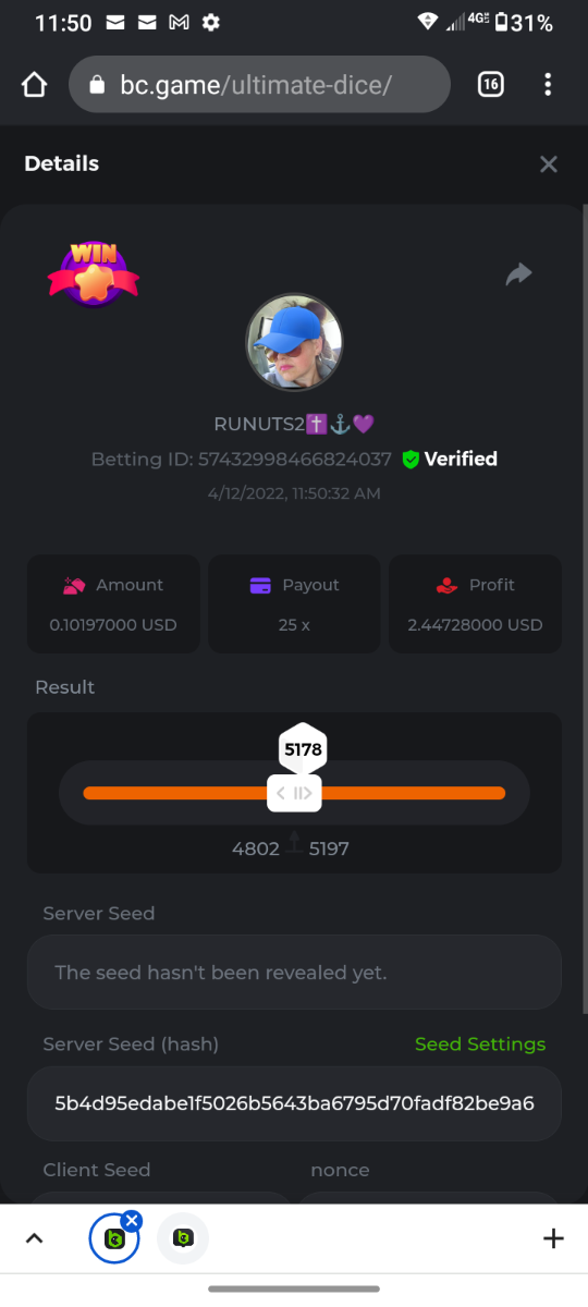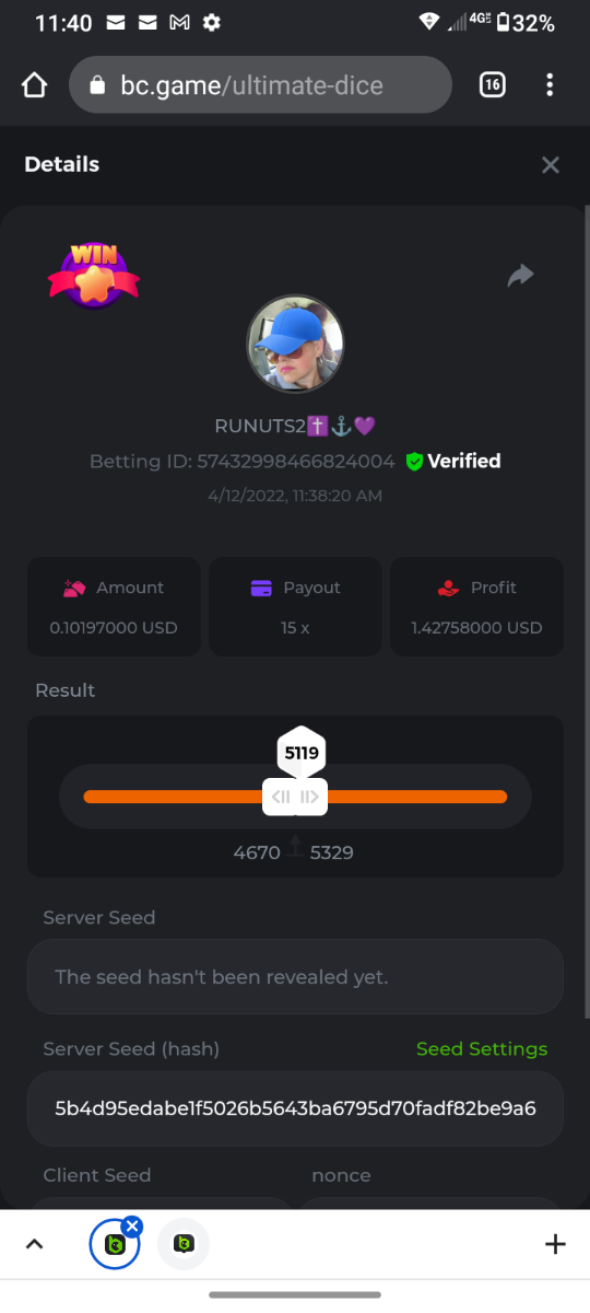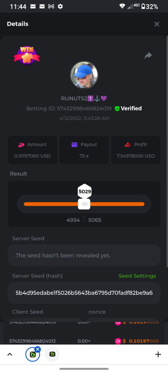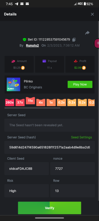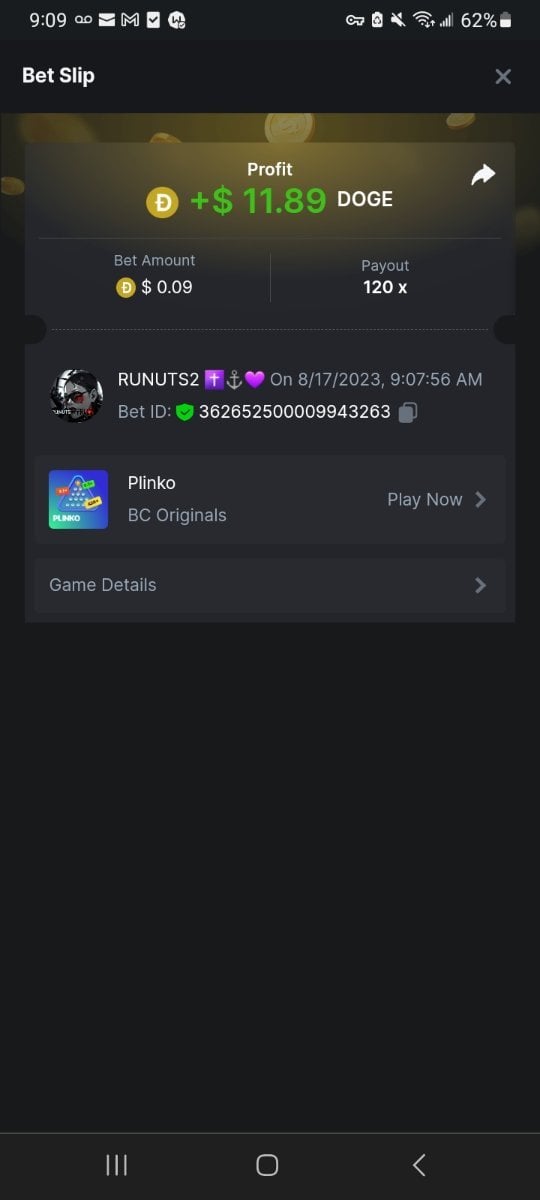 1. 16x | 26x | 27x | 29x | 33x | 37x | 43x | 56x | 58x | 76x | 83x | 88x | 110x | 120x | 130x | 170x | 260x | 420x | 620x | 1000x Some bets say 09 cents but showed $0.1 when I did the bet https://bc.game/#/sd/11FZ13ER2KDUZR https://bc.game/#/sd/11FZ1O7RLXAK9Z https://bc.game/#/sd/11FZ20E4G643PN https://bc.game/#/sd/11FZ2B9RQX25LV https://bc.game/#/sd/11G65L0NGEB7PN