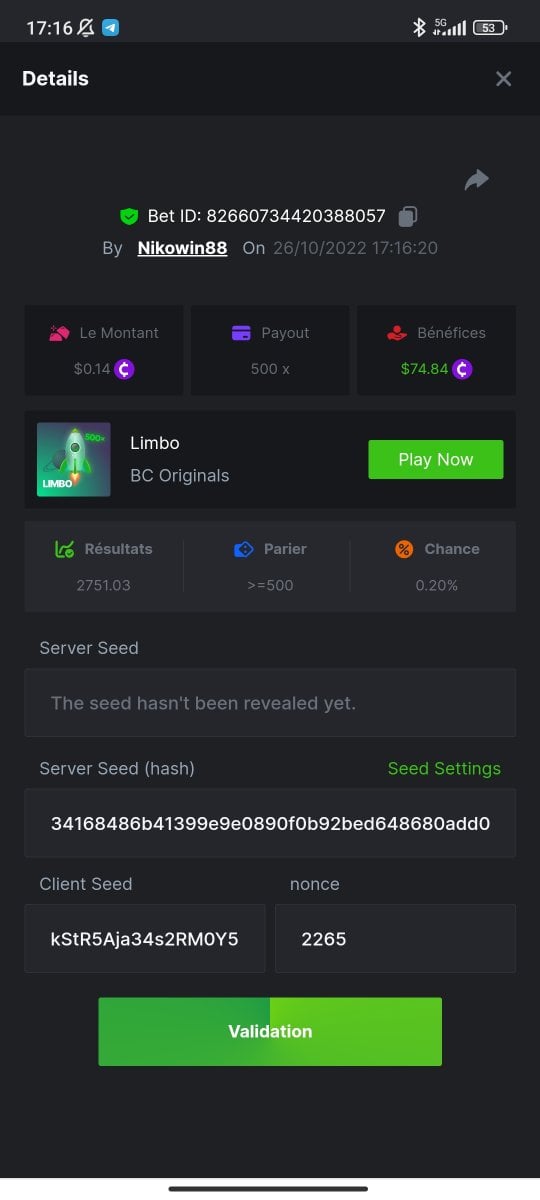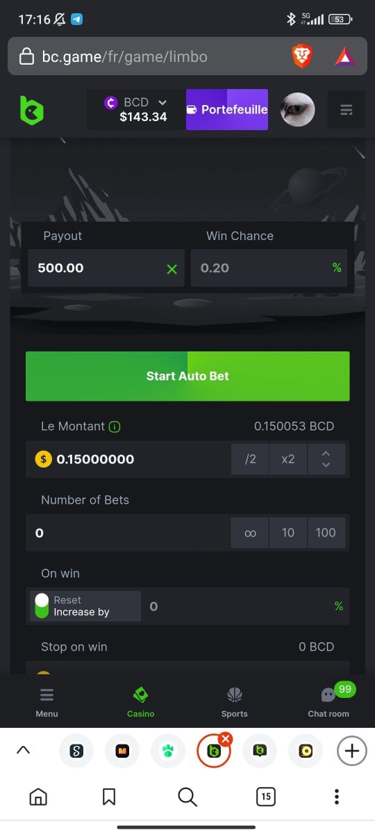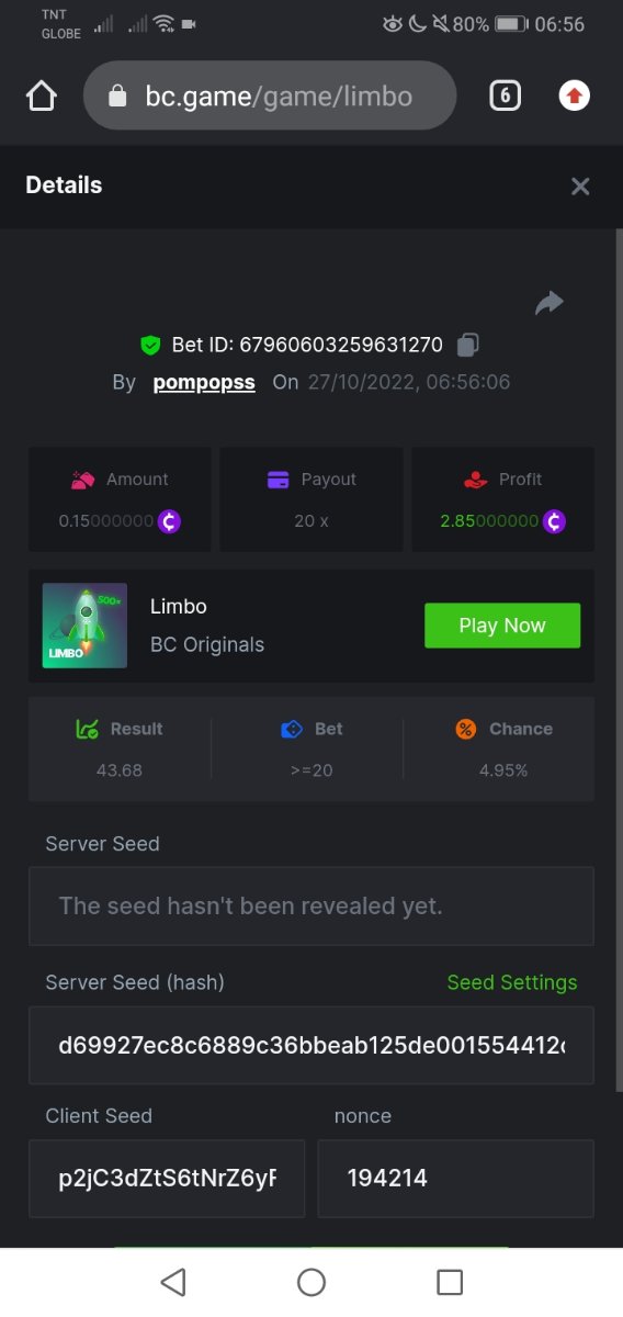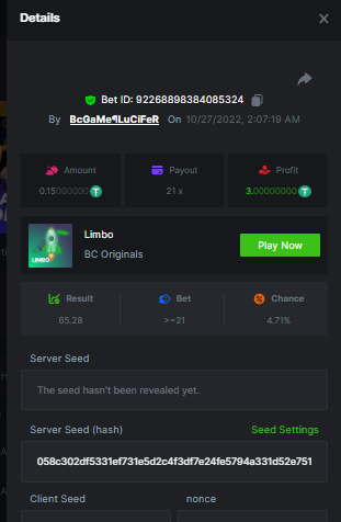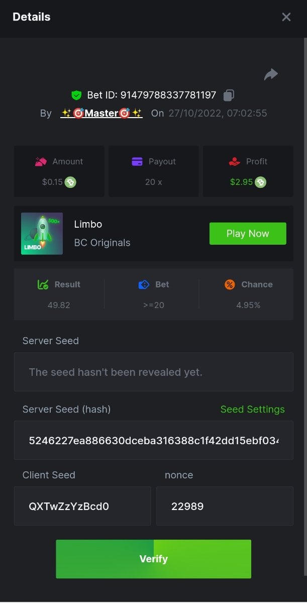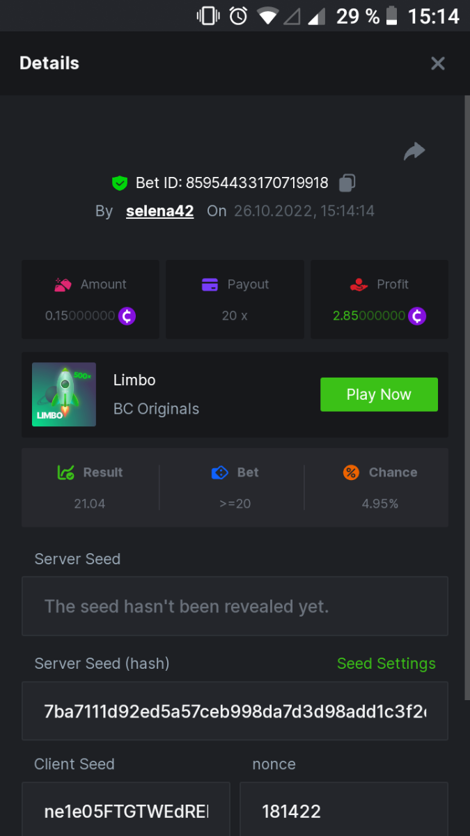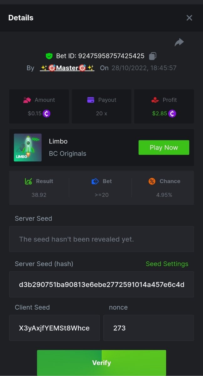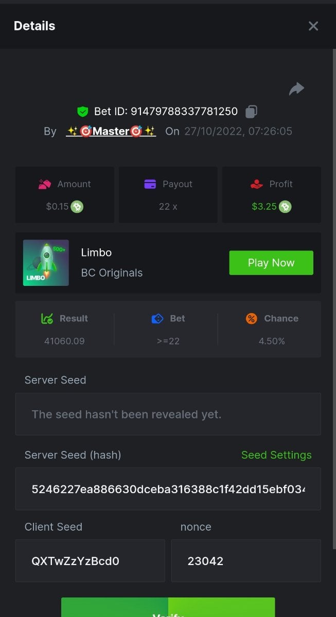 There's a glitch with bet value. I choosed 0.15 as bet value but in history it show 0.14 ( actually 0.149 ) so result show 0.14... I hope you guys would still count it as valid bc it's tricky. I post screenshots showing it