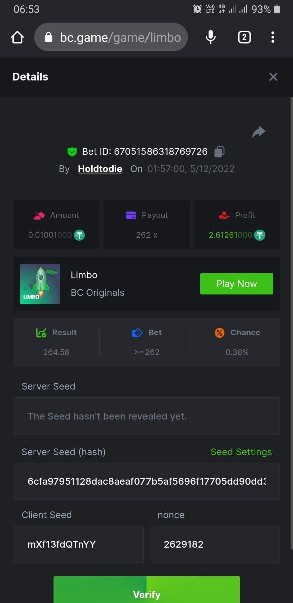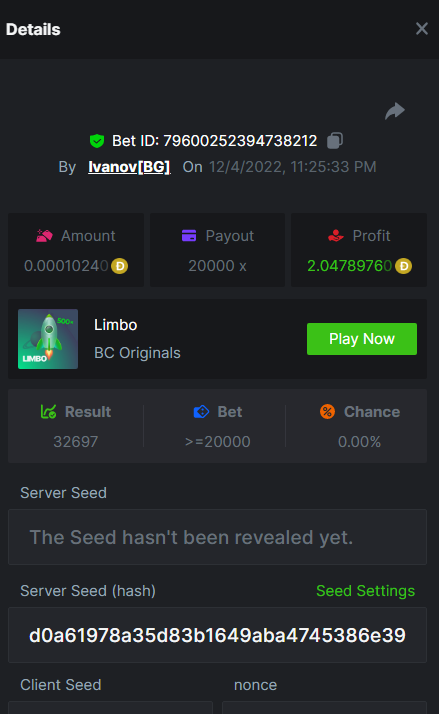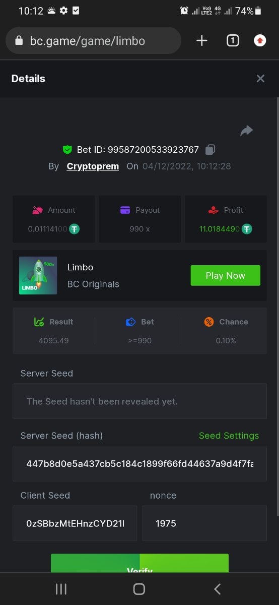 Wiro212sableng Posted December 4, 2022 Share Posted December 4, 2022 https://hash.game/#/sd/10YKLTYG7IKVMB uid : https://hash.game/game/limbo#/user/profile/2286288 Note: actually my bet set on dollar type 0.01 but didnt show 0.01 Link to comment Share on other sites More sharing options...