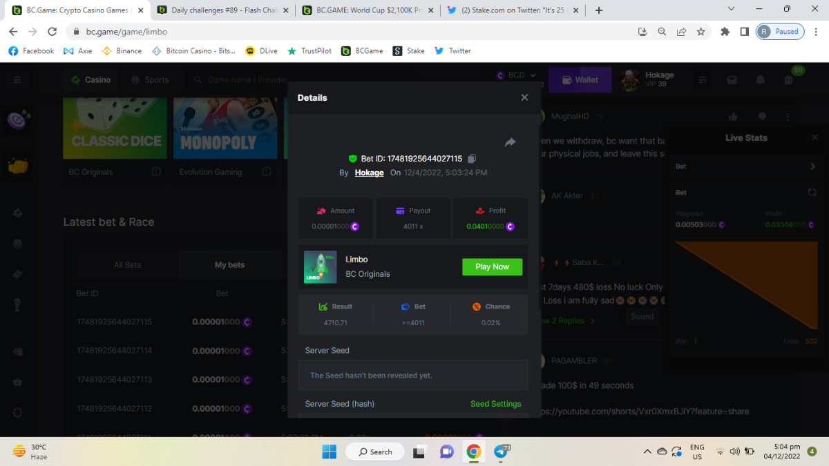 Black Tiger Posted December 4, 2022 Share Posted December 4, 2022 (edited) Read Carefully Before Start To Hunt Daily Challenges #89 : LIMBOHunt :Win the highest pay outMin Payout requirement 100xMin Level 4️Duration Starting : Now End time : 23.59 UTC Time How to Join? Make screenshot + paste your bet link + UID or Profile link minin bet amount - 0.01$ Any coin allowedReward Prizes 1st Place....... $7 BCD2nd Place..... $5 BCD3rd Place...... $4 BCD 🎖4th Place......$3 BCD5th - 10th Place......$1 BCD 🏵 Winners will be announcing next day after Roll Point Edited December 4, 2022 by Black Tiger 1 Link to comment Share on other sites More sharing options...