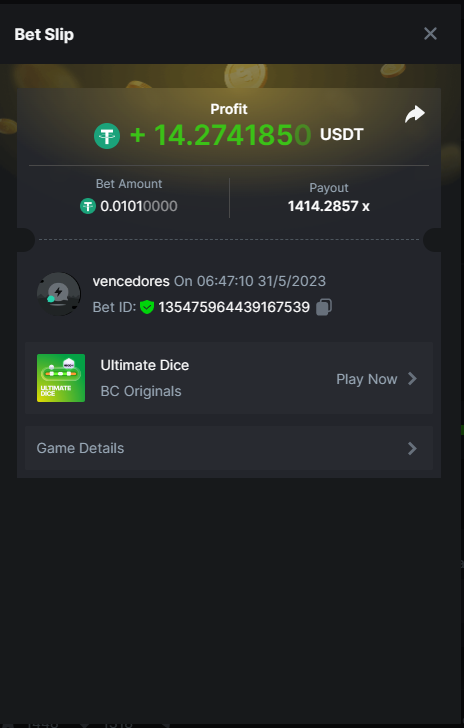 Maksypro Posted May 30, 2023 Share Posted May 30, 2023 Read Carefully Before Start To Hunt Daily Challenges #251 ULTIMATE DICE Hunt : Win the highest multiplier Min Payout requirement 100x Min Level 4 ๏ธDuration Starting : Now End time : 23.59 UTC Time How to Join? Make screenshot + paste your bet link + UID or Profile link Any coin, with min bet 0.01 USD is allowed (jb/bb/bcl not allowed) Reward Prizes 1st Place.....$7 BCD 2nd Place.....$5 BCD 3rd Place.....$4 BCD 4th Place.....$3 BCD 5th Place.....$2 BCD ๐ต Winners will be announcing next day after Roll Point! 1 Link to comment Share on other sites More sharing options...