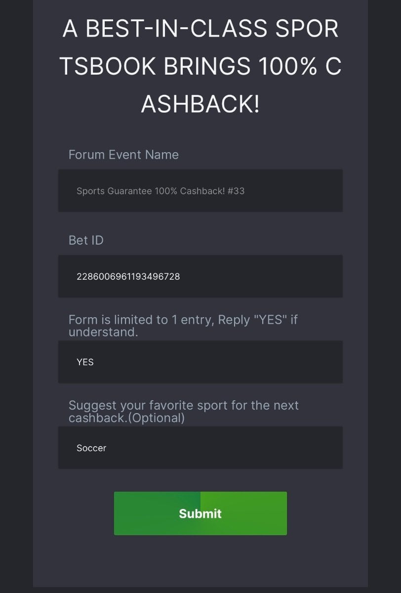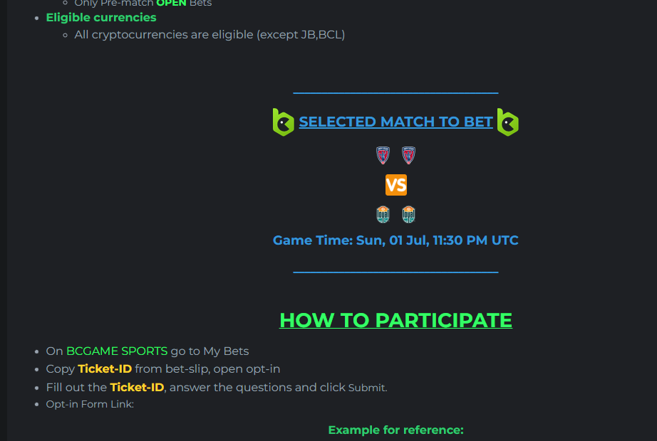 Event Team Popular Post BCGame_Maxim Posted June 25, 2023 Event Team Popular Post Share Posted June 25, 2023 (edited) Sports Guarantee 100% Cashback! #33 Starts: 25, Jun 01:00pm GMTEnds: 2, July 01:00pm GMT Dear BC Family!!! Enjoy our unique and fantastic guaranteed event—A Memorable, zero-risk chance to endeavour your betting instinct again. The opportunity is here, and luck in the match's odds, limited to the first 300 entries !!! First come first serve basis!!! This time, on your 'OPEN' bets we guarantee 100% cashback on your loss, up to US $100! Don’t miss this amazing chance! A chance to play zero-risk bet on the Specific Match. RULES Place a Bet on our Specific Soccer Match and get a guaranteed 100% cashback if you lose! Opt-in Form will be auto locked 30 minutes before the match start time. Only LOST bets from the first 300 entries will get 100% cashback. Place a single bet on any bet-market of your choice. Using a Free bet ticket to enter this event is non-acceptable. Only one(1) single bet per person is accepted. Bet with “OPEN” is valid to submit. Single bets only - Multis & Combo parlays are not acceptable. Hedging is strictly not allowed. 100% cashback, up to $100 REQUIREMENTS Minimum VIP Minimum VIP 22 Level and above. 1. Must be email verified. 2. Phone number must be verified 3. Must Enabled 2FA Minimum Odds requirement Minimum odds 1.5 (European) and above. Minimum bet size Equivalent to US $5 Bet type Only Pre-match OPEN Bets Eligible currencies All cryptocurrencies are eligible (except JB,BCL) ____________________________________ SELECTED MATCH TO BET Indy Eleven San Diego Loyal SC Game Time: Sat, 01 Jul, 11:30 PM UTCMagic Link ____________________________________ HOW TO PARTICIPATE On BCGAME SPORTS go to My Bets Copy Ticket-ID from bet-slip, open opt-in FORM LINK Fill out the Ticket-ID, answer the questions and click Submit. Opt-in Form Link: https://bc.game/forum_event/61995E0883D16C16 Example for reference: Ticket ID: 2222136272049279484 Fill out the form TERMS & CONDITIONS The ticket ID will not be counted if the selected match results in a void or postponement. If the selected match is canceled or postponement, the round of this event will be canceled. Cashed-out bets are not eligible. Hedging is strictly not allowed. Bets must be placed & settled during the time window specified above. This thread will automatically lock when the event time ends. One (1) entry per family. If someone attempts to claim multiple prizes, they will be disqualified from the challenge as well as all future challenges. This may also result in account termination. Failure to follow the instructions will result in the cancellation of your submission. By entering this challenge, you acknowledge that BC.GAME has final decision rights over results and placement. Cashback will be paid within 72 hours after the event on the forum finishes in BCD for bets placed in cryptocurrency and in fiat currency for bets placed using fiats up to a maximum of $100. Good Luck everyone! Edited June 29, 2023 by BCGame_Maxim Match Link updated, fill out the opt-in form : https://bc.game/forum_event/61995E0883D16C16, Time date is correct. 12 Link to comment Share on other sites More sharing options...