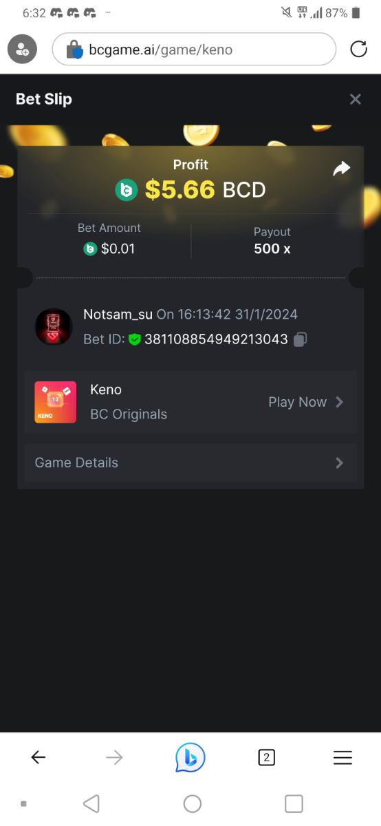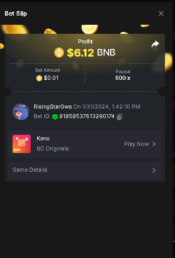 Moderator Giandreas Posted January 31, 2024 Moderator Share Posted January 31, 2024 Read Carefully Before Start To Hunt Forum Daily Challenges #496Hunt : KENO Win the highest pay out Min Payout : x90 Min Level 10️Duration Starting : Now End time : 23.59 UTC Time How to Join? Make screenshot + paste your bet link + UID or Profile link Any coin, with min bet 0.01 USD is allowed (jb/bb/bcl not allowed)Reward Prizes 1st Place.....$7 BCD 2nd Place.....$5 BCD 3rd Place.....$4 BCD 4th Place.....$3 BCD 5th Place.....$2 BCD 🏵 Winners will be announcing next day after Roll Point! Link to comment Share on other sites More sharing options...