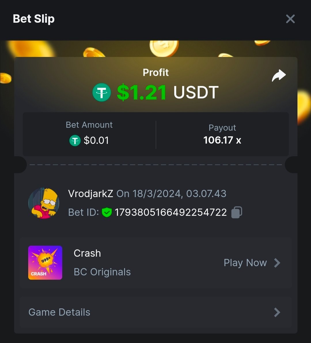 Moderator Giandreas Posted March 17, 2024 Moderator Share Posted March 17, 2024 Read Carefully Before Start To Hunt Forum Daily Challenges #542Hunt : Crash Win the highest pay out Min Payout : x20 Min Level 10 ️Duration Starting : Now End time : 23.59 UTC Time How to Join? Make screenshot + paste your bet link + UID or Profile link Any coin, with min bet 0.01 USD is allowed (jb/bb/bcl not allowed) Reward Prizes 1st Place.....$7 BCD 2nd Place.....$5 BCD 3rd Place.....$4 BCD 4th Place.....$3 BCD 5th Place.....$2 BCD 🏵 Winners will be announcing next day after Roll Point! 1 Link to comment Share on other sites More sharing options...