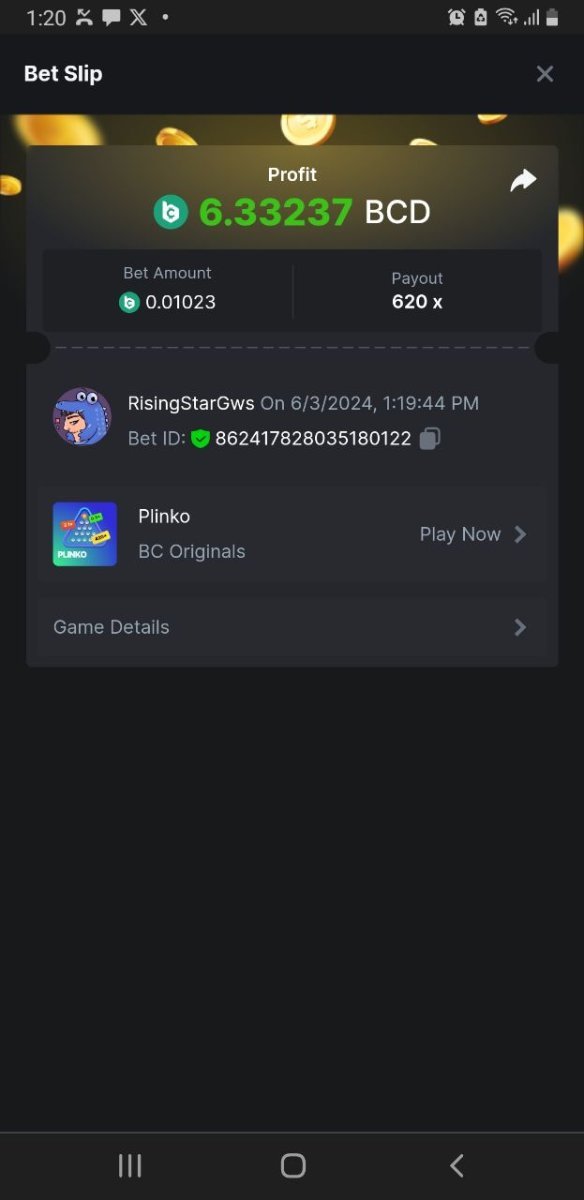 2nd place . . . .RisingStarGws   620 x 6.33 . . . .5$ BCD