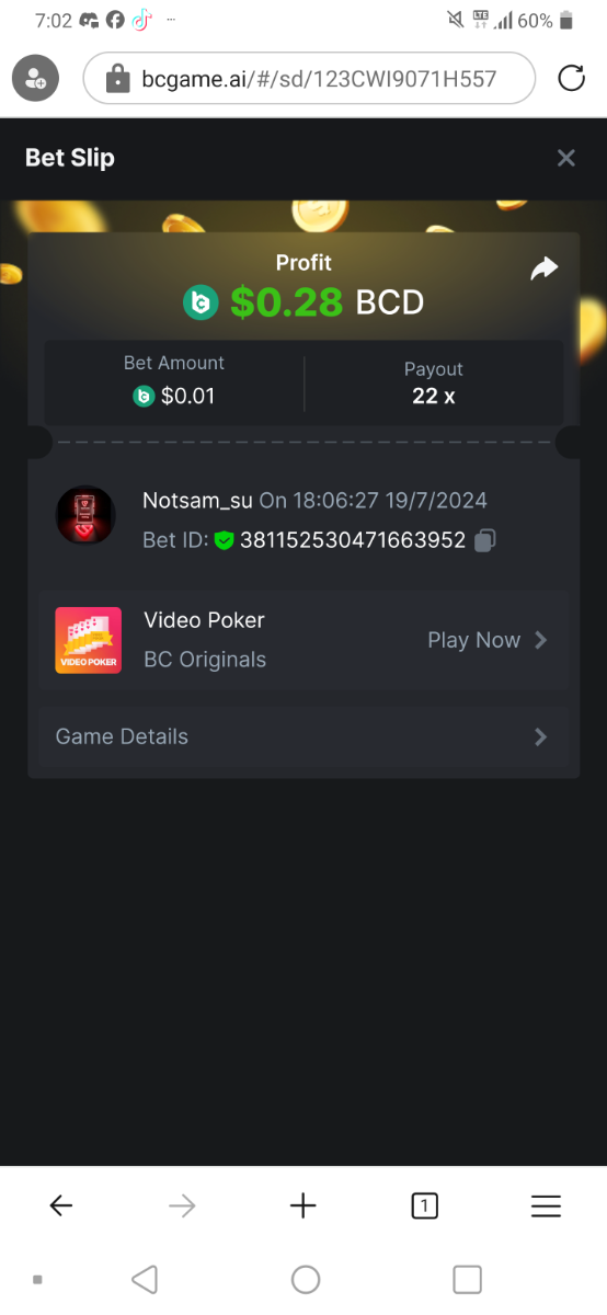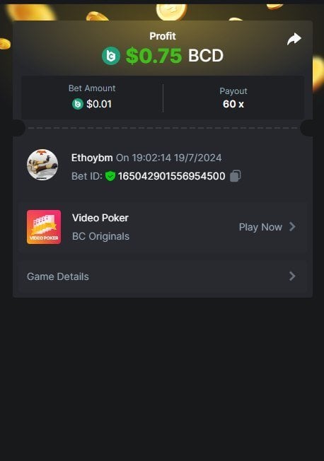 Moderator Giandreas Posted July 19, 2024 Moderator Share Posted July 19, 2024 Read Carefully Before Start To Hunt Forum Daily Challenges #666Hunt : Video poker Win the highest pay out Min Payout : x6 Min Level 10️Duration Starting : Now End time : 23.59 UTC Time How to Join? Make screenshot + paste your bet link + UID or Profile link Any coin, with min bet 0.01 USD is allowed (jb/bb/bcl not allowed)Reward Prizes 1st Place.....$7 BCD 2nd Place.....$5 BCD 3rd Place.....$4 BCD 4th Place.....$3 BCD 5th Place.....$2 BCD 🏵 Winners will be announcing next day after Roll Point! 1 Link to comment Share on other sites More sharing options...