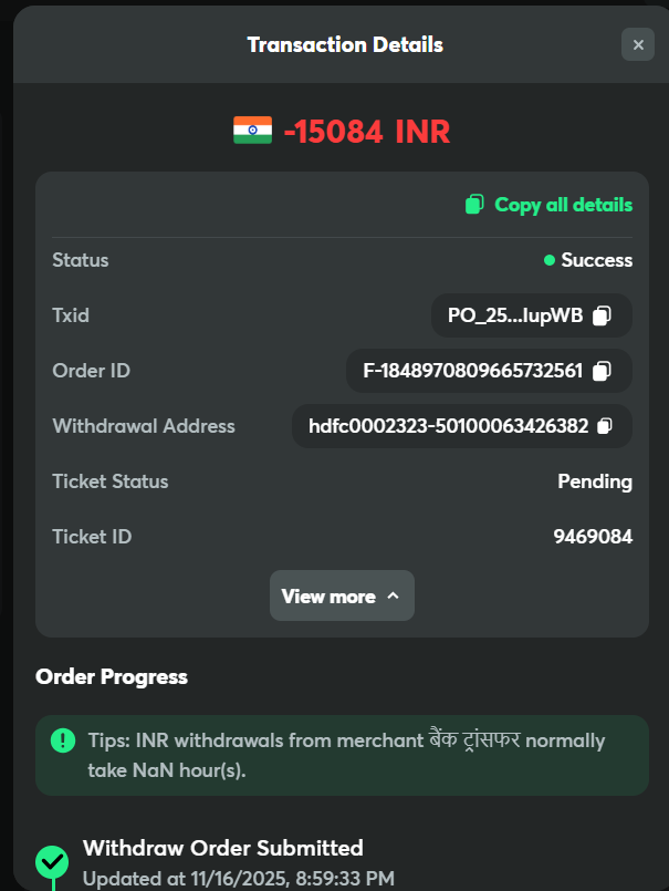 rajuranghu Posted November 24 Share Posted November 24 Dear Team, This is my withdrawal request ( order ID F-1848970809665732561 placed on 16.11.2025, and on 17.11.2025, I got a notification stating that the withdrawal was processed, but I have not received money in my bank account. I have raised the ticket (9469084) and received a message stating that it is being processed as per the confirmation from the merchant. Now it's been I have been following up with customer service without any positive response from them. I have shared the bank statement as well to check. Also, I made three deposits on 20.11.2025 (F-1849337243113407223, F-1849336369810366236 & F-1849336219806269724), but the amount has not been added to the wallet yet. I have been requesting customer service to look into it and do the needful where as no positive feedback from them. Their simple answer is that your ticket is processing. Please wait. No other reply. The AI chat makes me very upset. I request you to look into the above matter and do justice for me. Link to comment Share on other sites More sharing options...
