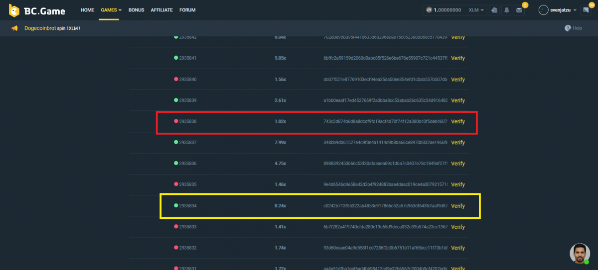 svenjatzu Posted October 11, 2020 Author Share Posted October 11, 2020 round won is https://bcgame-project.github.io/bcgame-crash/?hash=c0242b713f55322ab4853e917866c52a57c963df643fcfaaf9d87dcc14e9ddde 5 xrp that i didnt place the bet and crashed at 1.02 is https://bcgame-project.github.io/bcgame-crash/?hash=743c2d874b6d8a8dcdf9fc19acf4d70f74f12a380b43f5deb4607f80852f4c33 Link to comment Share on other sites More sharing options...