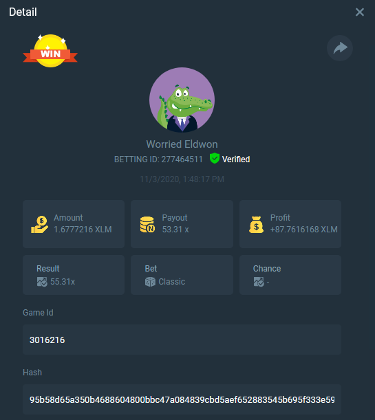 I have seen the Cat many, many times. My usual biggest multiplier so far has been around 4.89x, so I tried to hang on but I got scared and pressed Cash Out at 70 XLM, it cashed me out at 53.31x and crashed at 55x, so I felt very lucky and happy with 87 XLM, now I want to get a win with a Screenshot of the Cat on the screen over 125x, and I'll make it into a t-shirt design.