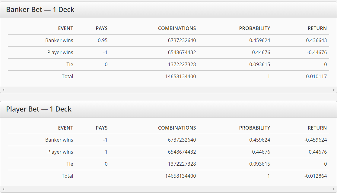_Joe Posted November 7, 2020 Share Posted November 7, 2020 Should you bet on PLAYER? BANKER? TIE? Or PAIR BETS?? This EPIC guide is here to help you! Sit back, relax, and get ready to throw your chips on the table as I guide you through BCGame’s latest edition to the family - BACCARAT! Introduction · House edge – 1.1% - 98.9% RTP (Return to player) · Single deck game – each round starts with a new randomised single deck · Multiplayer – you are playing alongside others on the table · Cards are given point values as follows: Ace = 1, 2-9 = pip (shown) value, 10 and face cards = 0. More details of this below In baccarat, each card has a point value: the 2 through 9 cards in each suit are worth face value (in points); the 10, jack, queen, and king have no point value (i.e. are worth zero); aces are worth 1 point; jokers are not used. Hands are valued according to unit’s digit of the sum of their constituent cards. For example, a hand consisting of 2 and 3 is worth 5, but a hand consisting of 6 and 7 is worth 3 (i.e., the 3 being the units digit in the combined points total of 13).The highest possible hand value in baccarat is therefore nine. Rules Players have 15 seconds to decide whether to bet on the Player, Tie, Player Pair and/or Banker Pair. After the 15 seconds are up, no more bets are allowed and the dealer gives two cards each to the Player and Banker hands. The maximum number of points in both the Player and Banker hands is 9. The way to arrive at the points per hand is to take the total points of each individual card in the hand. If the sum is more than 9, then drop the first digit. For example, if either hand had a 9 and 7, then you would drop the 1 from the total of 16, for a 6-point hand. A third card may or may not be dealt to either the Player or Banker hands, depending on the following rules. If either the Player or Banker have 8 or 9 points, it is referred to as a "natural." If there is at least one natural, then both hands will stand. Otherwise, if the Player's total is 5 or less, then the Player hand will draw one more card, otherwise, with 6 or 7 points, the Player hand stands. If the Player hand stands with 6 or 7 points, then the Banker hand will draw a third card on a total of 5 or less. Otherwise, with 6 or 7 points, the Banker will stand. If the Player does draw a third card, then use the Banker will use his positional advantage to decide whether to take a third card according to his total and the third card drawn to the Player, according to the following table. H = Draw third card S = Stand on two cards How does each outcome win? · The score of the Player and Banker hands are compared; the winner is the one that is greater. · The Tie bet wins if the Player and Banker hands tie. All bets on player and banker are a push (bet returned) · The Player Pair bet wins if the first two cards in the Player hand are of the same rank. · The Banker Pair bet wins if the first two cards in the Banker hand are of the same rank. Payout · Player bet: Wins pay 1 : 2 · Banker bet: Wins pay 1 : 1.95 · Tie bet: Win Pays 1 : 9 · Player Pair and Banker pairs: Wins pay 1 : 11 The reason the Banker gets paid less than the Player is the Banker enjoys a positional advantage, with more information available to make the decision on drawing a third card. The Math! The following return tables show the possible outcomes of the Player, Banker, and Tie bets for a single deck game. As the lower right cells in each table show, the house edge is 1.01% on the Banker bet, 1.29% on the Player bet, the odds and edge for Tie and Player/Banker Pair bets is also shown below. I hope this guide helped you in your quest for Baccarat glory! Good luck playing and stay safe! Link to comment Share on other sites More sharing options...
