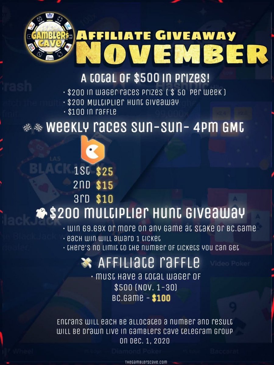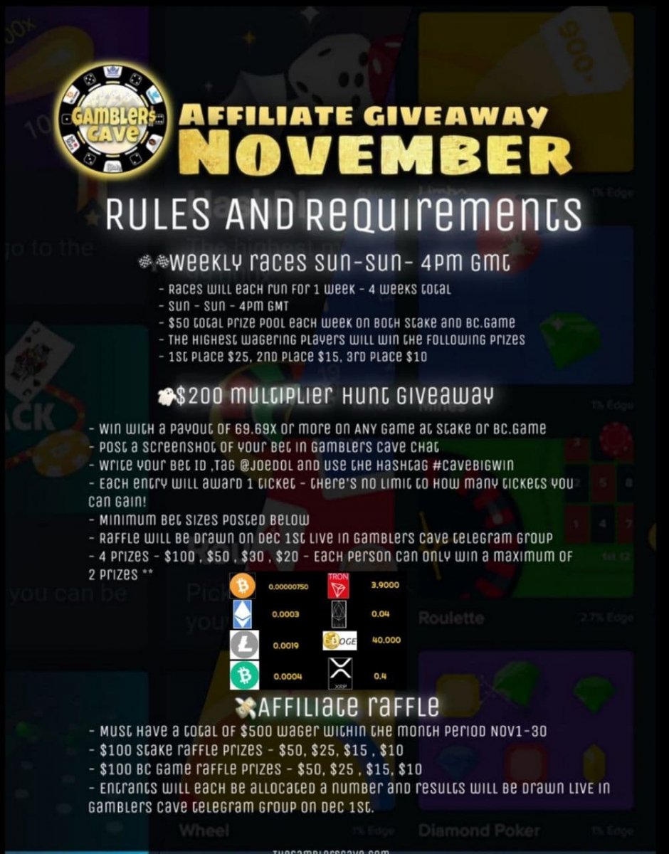 _Joe Posted November 9, 2020 Share Posted November 9, 2020 Hey Everyone, I’m running a giveaway for November which has a total of $500 in prizes for my BCGame affiliates. The comprises of $50 per week in a weekly wager race, $100 in monthly raffle prizes and $200 in a multiplier hunt giveaway. I do giveaways like this every month so please come and follow over on my telegram group and channel and join in the fun! The giveaways are for my affiliates only, however I do also do random giveaways for non-affiliates. Telegram Group - @GamblersCave Telegram Channel for giveaway notifications - @GamblersCaveGiveaways Last week’s winners of the wager race were – 1. Dakata1 - $25 2. Mhayjhai - $15 3. GKD69 - $10 Week 2 is now LIVE and running, full details are below Link to comment Share on other sites More sharing options...
