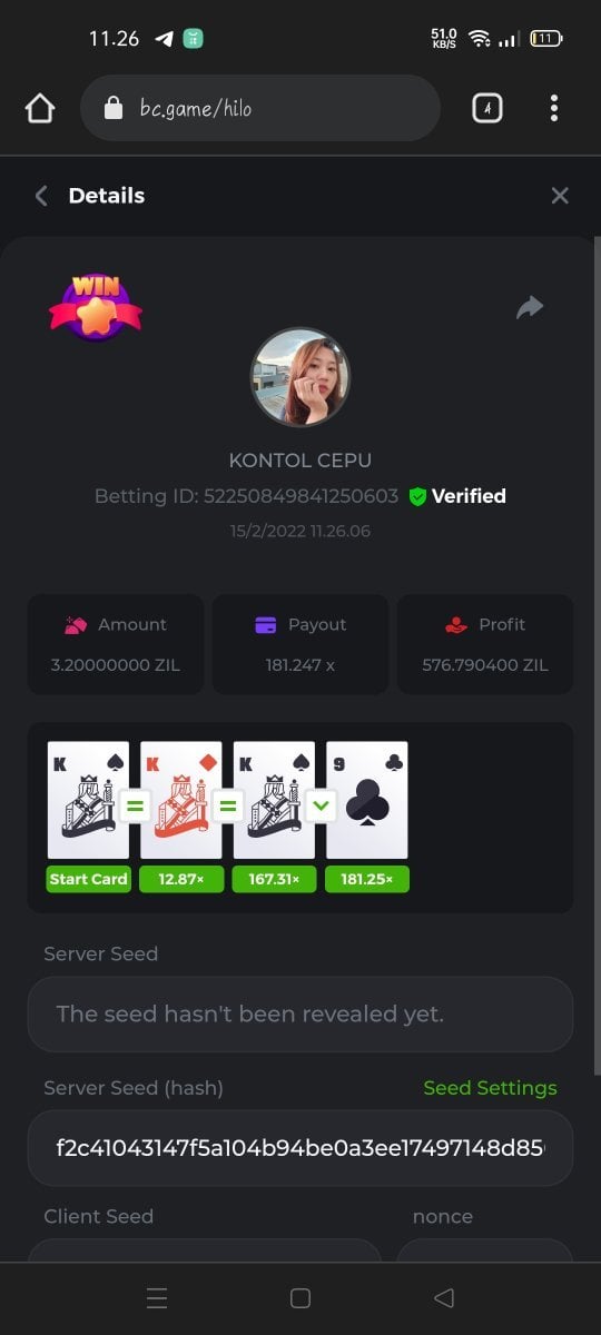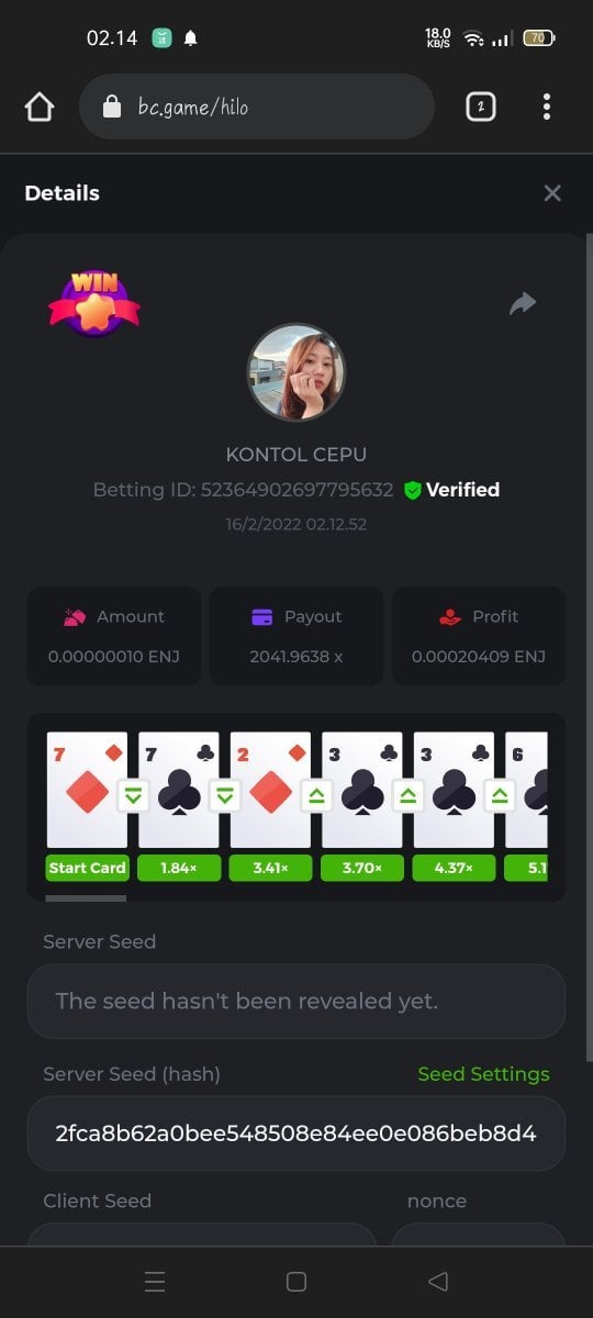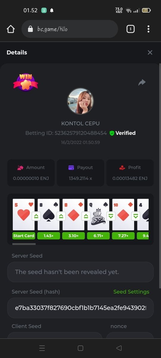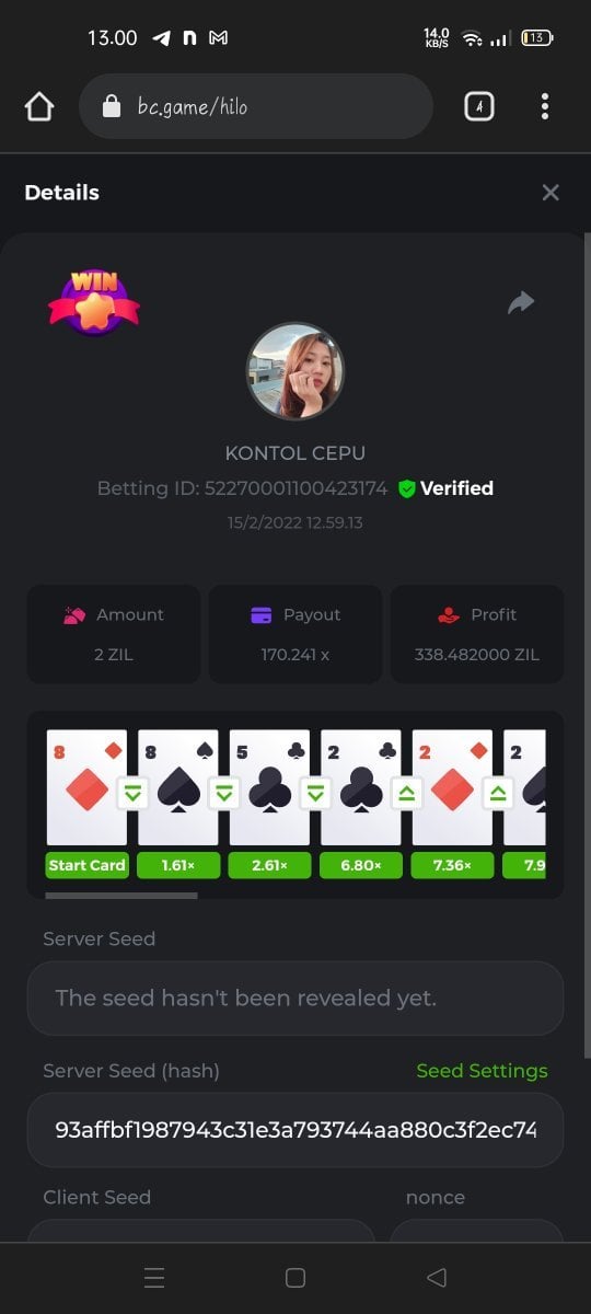 Wiro212sableng Posted February 14, 2022 Share Posted February 14, 2022 King Hilo weekly challenge Periode 11-18 Februari2022 Challenge dengan mencari total Raihan poin tertinggi di game Hilo Peraturan permainan: - Koin bebas selain JB coin Sistem point: Payout 100x atau lebih : 10 point Payout 200x atau lebih : 20 point Payout 300x atau lebih : 30 point Payout 400x atau lebih : 40 point Dan seterusnya payout kelipatan 100 di hitung 1 dan akan dikalikan 10 point. Misal : payout 1455x : 14 x 10 point : 140 point Post username kalian dengan reply post di bawah Post screenshot betid kalian di sini, dan edit post untuk memasukan screenshot bet id selanjutnya User level 3 ke atas no multi account Koin bebas selain bj koin Khusus user Indonesia Post screenshot betidnya di forum Bet berlaku mulai tgl 15 Februari 2022 jam 06.05 am dan max post 24 jam dari semenjak bet di buat. Challenge berakhir Jumat, 18 Februari pukul 19.00 pm Hadiah: 1. 12 bcd shitlink 2. 8 bcd shitlink 3. 5 bcd shitlink 4-10. @2 bcd shitlink 10-15 @1 bcd shitlink Keputusan juri tidak dapat di ganggu gugat Link to comment Share on other sites More sharing options...