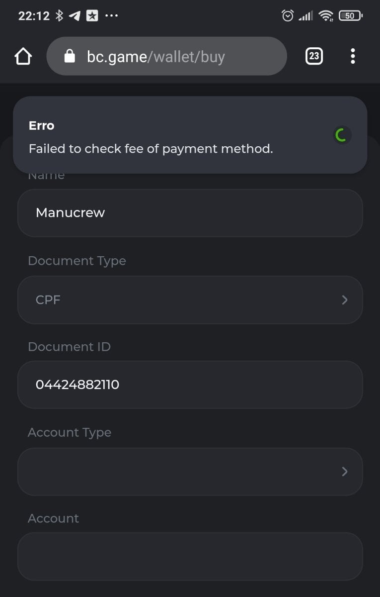Boa noite já faz dias que venho tentando sacar meus ganhos e não consigo pois fica dando este erro aqui Failed to check fee of payment method e  não é só comigo pois amigos que usam o bcgame  também me falaram que estão com o mesmo problema que eu já falei com o suporte ao vivo falaram que estavam arrumando mas até agora ainda não foi concertado por favor arrumem o mais rápido que puderem pois estou precisando sacar!