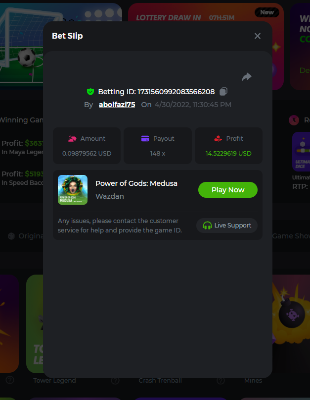 BCGame_POP Posted April 29, 2022 Share Posted April 29, 2022 $2k Wazdan Weekend Multiplier Battle We are hosting this exclusive event for our slot players on the platform for the weekend. Get the best possible multiplier on the highly acclaimed Wazdan Games listed below. All eligible participants will get the prize, hop in your bets within the next 72 hours. Eligible Games: Win the highest multiplier on the Wazdan games listed below 1. Power of Gods: Medusa 2. Jelly Reels 3. Hot Slot 777 Crown The highest multiplier reached in each game will be added together and counted as total points. Bonus buys are allowed. If the player submits multiple winning entries for the same game, the entry with the highest multiplier will be valid. Minimum VIP Tier Must be VIP04 or higher in order to enter this event. Minimum Payout Minimum payout to qualify is 10x (in any game) for a valid entry. Minimum Bet Size Power of Gods: Medusa - $0.1 Jelly Reels - $0.1 Hot Slot 777 Crown - $0.2 Eligible Coins All cryptocurrencies are eligible (excepting JB, and BCL). Free Play Mode is not valid for this event. Prize Pool & Reward Breakdown The winners will win a share of the prize pool based on the detailed ranking below. All other participants who complete all minimum requirements will receive a 35% share of the total prize. How to Enter Access the game to select your Bet ID, click on the Share icon (↷) and then Copy link. Return to the topic, paste the link in the field "Reply to this topic..." E.g.: https://bc.game/sd/?sd=10JHVKPTK0BIFN In the same post, upload a screenshot of your win by clicking the game ID WITH VIEW IN USD mode ENABLED (accessible at the bottom of dropdown menu for your wallet up top, and Submit Reply. Done! This way, we can ensure that your bet indeed met the minimum requirement at the time of placing it: https://bc.game/sd/?sd=10JHVKPTK0BIFN Additional Rules: Please combine all of your hits together in a SINGLE post. Edit your existing post for additional hits, don't create a new post. Bets must be posted within 24 hours of placing bet in order to keep things fair for everyone. Bets must be made during the specified time window stated above. This thread will lock automatically when the time period is over. One (1) entry per household. Anyone found attempting to win multiple prizes will be disqualified from this challenge as well as all future challenges. Failure to follow instructions will result in your submission being null and void. By entering this challenge, you acknowledge that BC.Game has the final decision on results and placement. Payouts will be made within 48 hours of challenge completion. Prizes will be paid out in BCD. Link to comment Share on other sites More sharing options...
