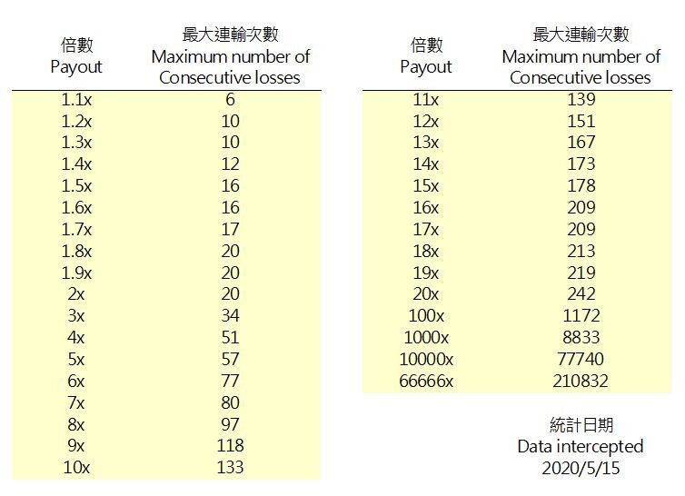 爆點遊戲最大連輸次數列表 List of maximum consecutive losses of different payouts in the history of Crash game