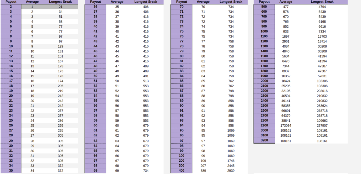 Here we use the salted hash to sample 100 million calculation results, and recalculate the Longest continuous of below the specified payout.
